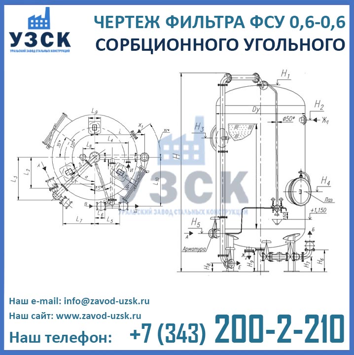 В типовом исполнении производство фильтров ФСУ-0.6-0.6 осуществляется из углеродистой стали. Являясь производителем угольных фильтров, завод УЗСК осуществляет также изготовление нестандартных фильтров ФСУ из легированной или нержавеющей стали, по индивидуальным размерам и чертежам заказчика.