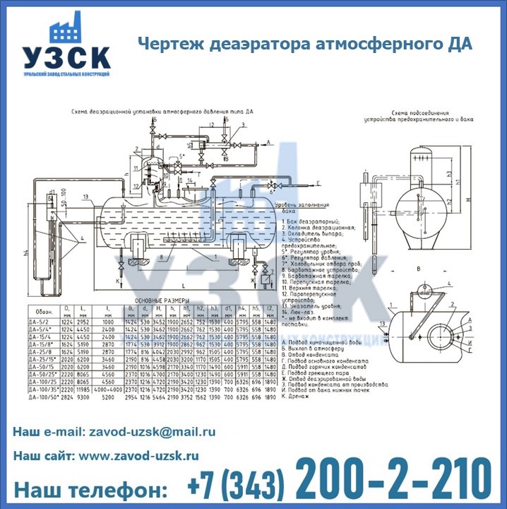 Приобрести качественное оборудование, в том числе, деаэраторы ДА, можно в компании УЗСК в Талдыкоргане. Мы предлагаем долговечную и надежную продукцию по приемлемой цене. Заказать и купить деаэраторы или другие изделия высокого качества можно через сайт Уральского Завода Стальных Конструкций, или позвонив по указанному в разделе «Контакты» телефону.